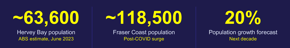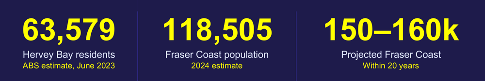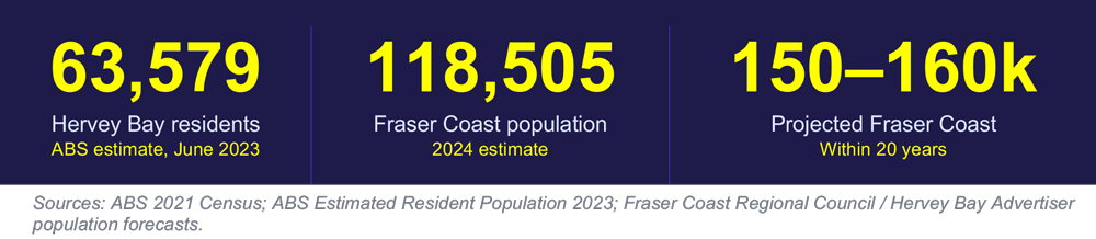 Sources: ABS 2021 Census; ABS Estimated Resident Population 2023; Fraser Coast Regional Council / Hervey Bay Advertiser population forecasts.