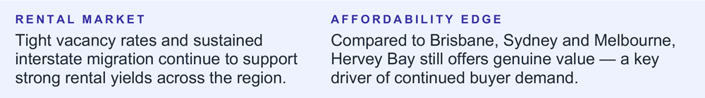 From a lifestyle perspective, Hervey Bay remains highly attractive and relatively affordable compared to larger Queensland markets. Its coastal setting, relaxed pace of life, and proximity to some of Australia’s most iconic natural attractions — K’gari, the Great Barrier Reef, the humpback whale migration corridor — continue to draw interstate migration, particularly from Sydney and Melbourne. This population growth is a key factor supporting both rental demand and long-term price growth.