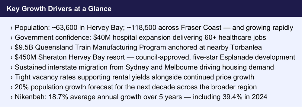 Government infrastructure. Interstate migration. Rising employment. Hervey Bay is no longer just a retirement town — it is one of Queensland’s most compelling regional growth stories.