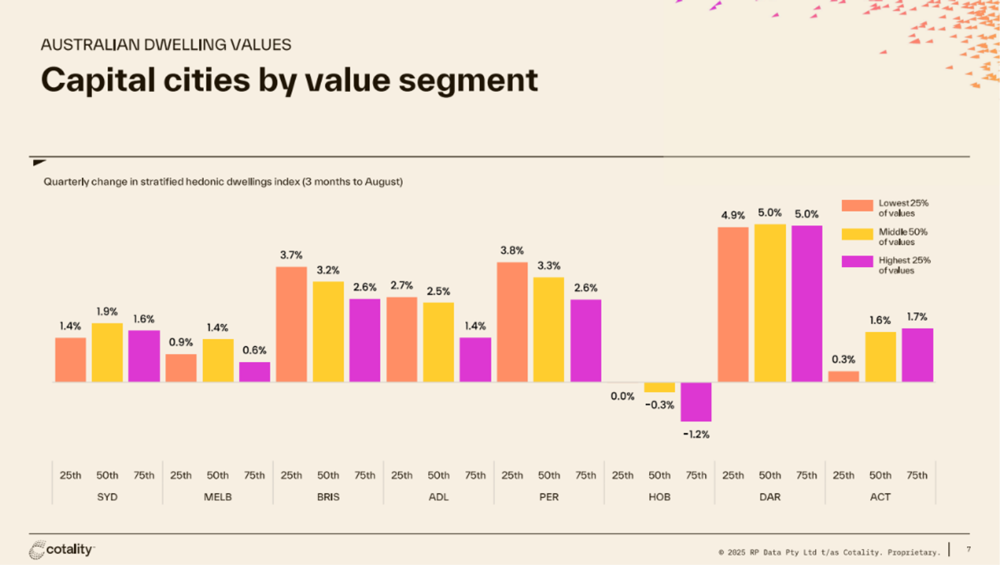 - More affordable homes (the bottom 25% of values) are rising fastest — Perth (+3.8%) and Brisbane (+3.7%) stood out this quarter.
