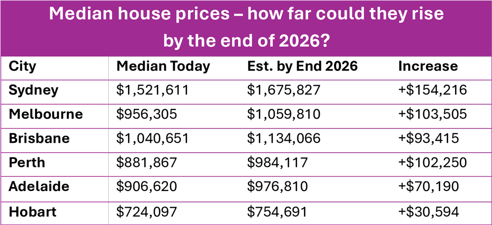Westpac’s latest housing forecast suggests median house prices could rise by as much as $154,000 by the end of 2026. These projections, sourced from Westpac and Cotality (RP Data) and published by Canstar, point to a strong outlook across all major cities.