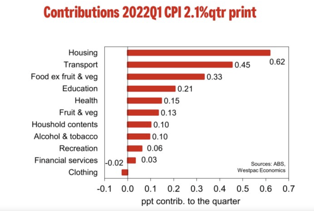 The ABS reports that the headline CPI increased by 2.1% over the quarter for an annual rise of 5.1% – well ahead of the 1.3% quarterly rise and 3.5% annual rise recorded over the previous December quarter.