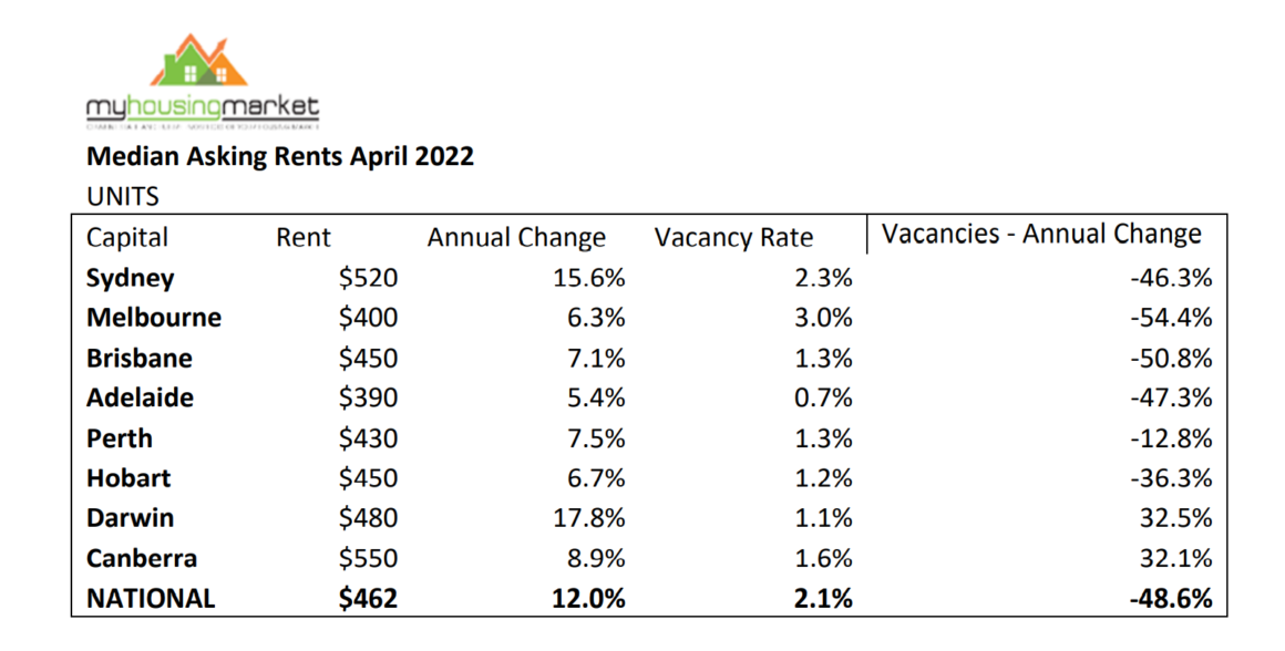 Unit rentals have also recorded strong increases generally over the past year with the April national median weekly asking rent for units at $462 – an annual increase of 12.0%, with the national vacancy rate for units falling to 2.1% over the month.