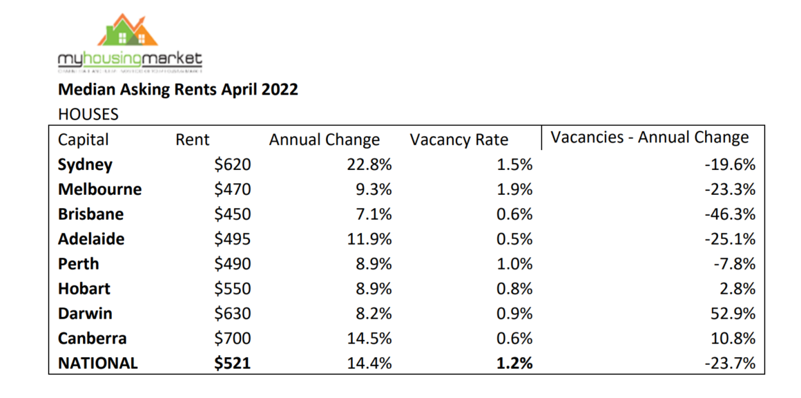 All capitals have recorded significant increases in monthly asking house rents over the year ending April 2022, with Sydney the highest up 22.8% followed by Canberra higher by 14.5% and Adelaide up 11.9%.